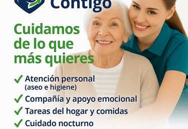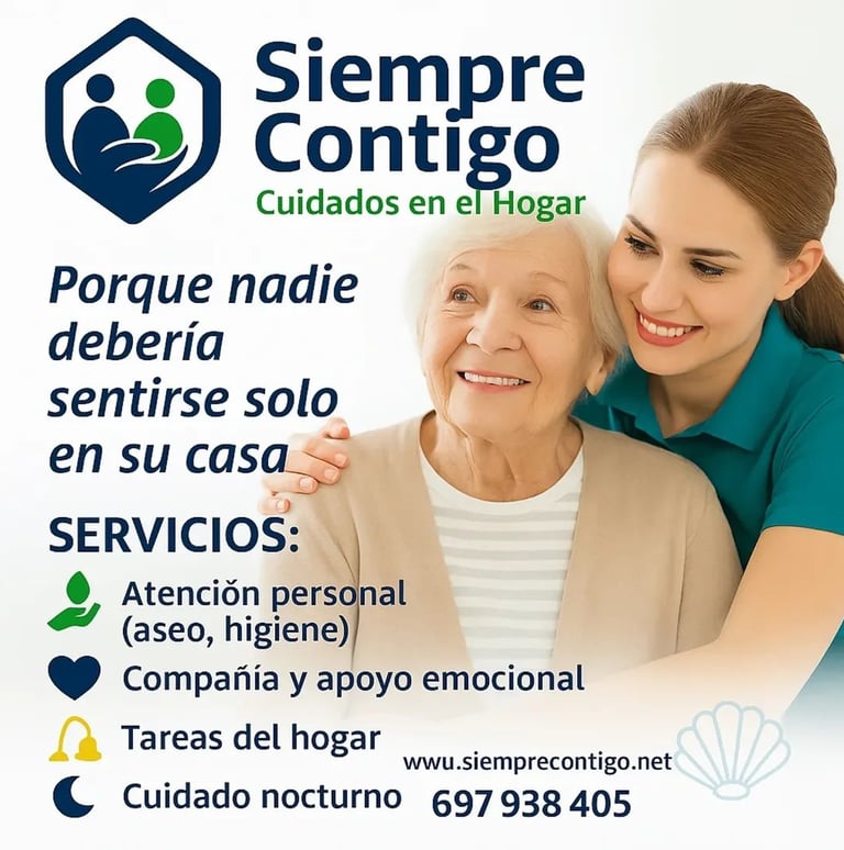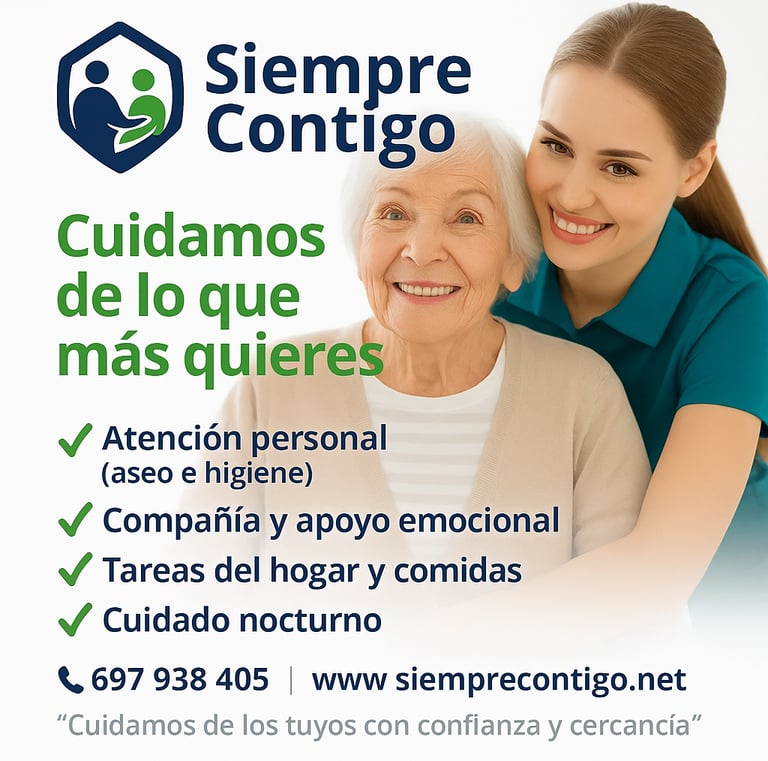 📌 En Siempre Contigo ofrecemos servicios de cuidado pensados para dar apoyo en el día a día: higiene y movilidad, acompañamiento en casa u hospital, supervisión de medicación, ayuda en comidas y compras, cuidado nocturno y respiro familiar. Siempre Contigo, cuidando de los tuyos con confianza y cercanía.